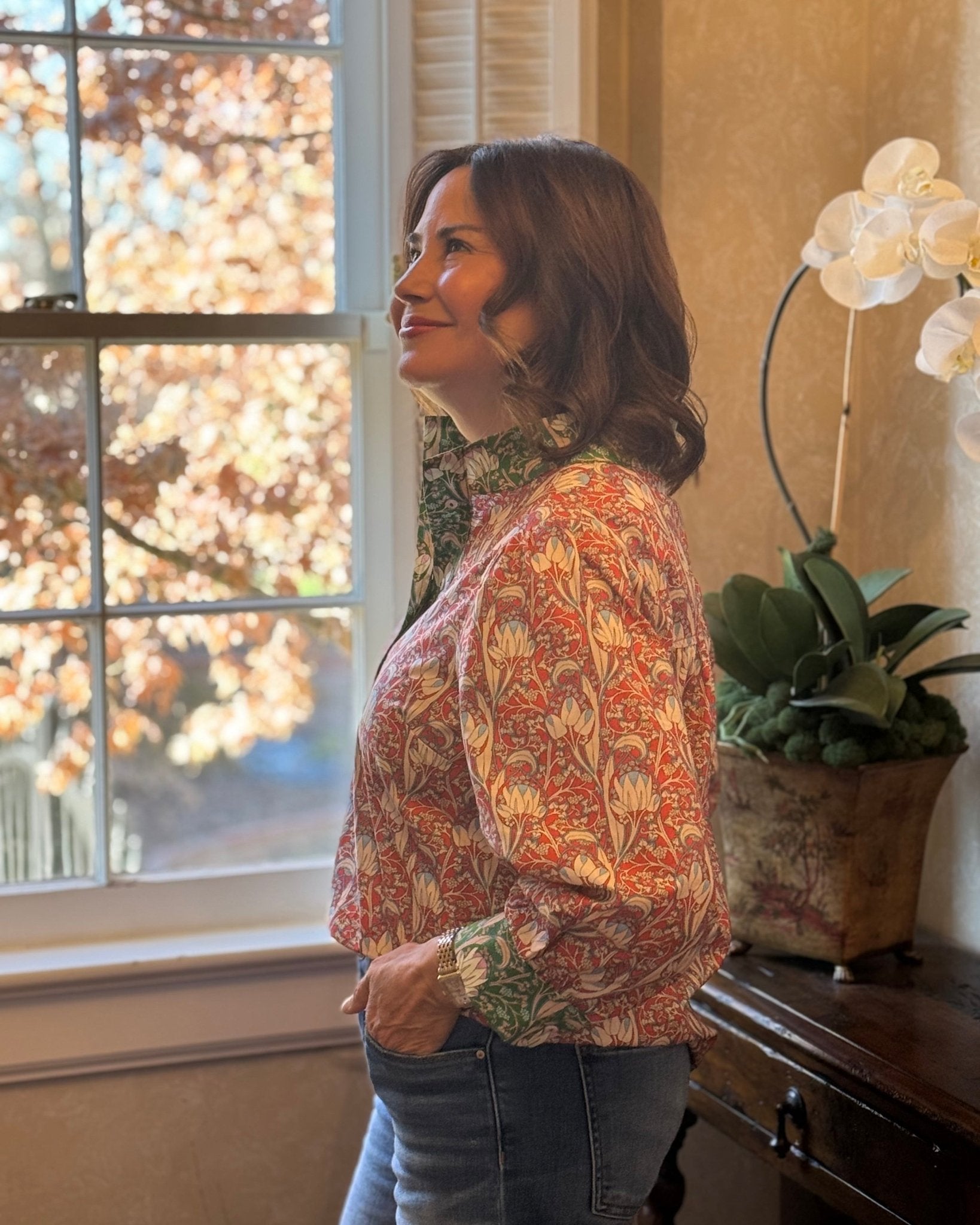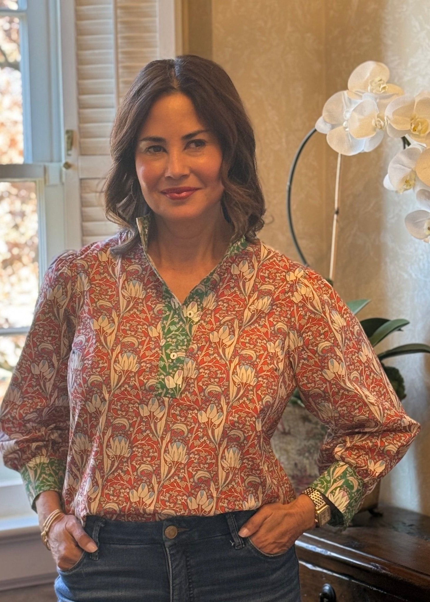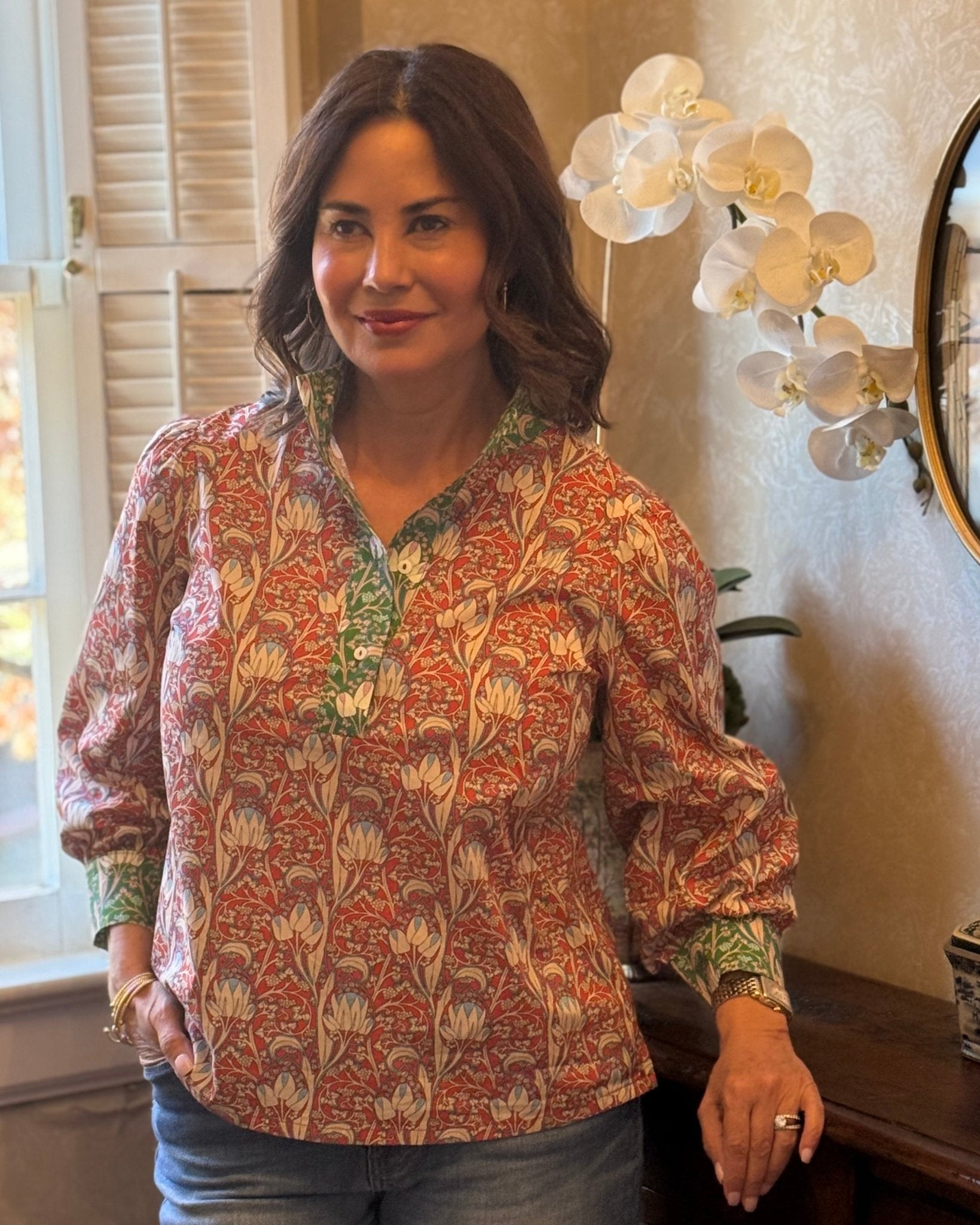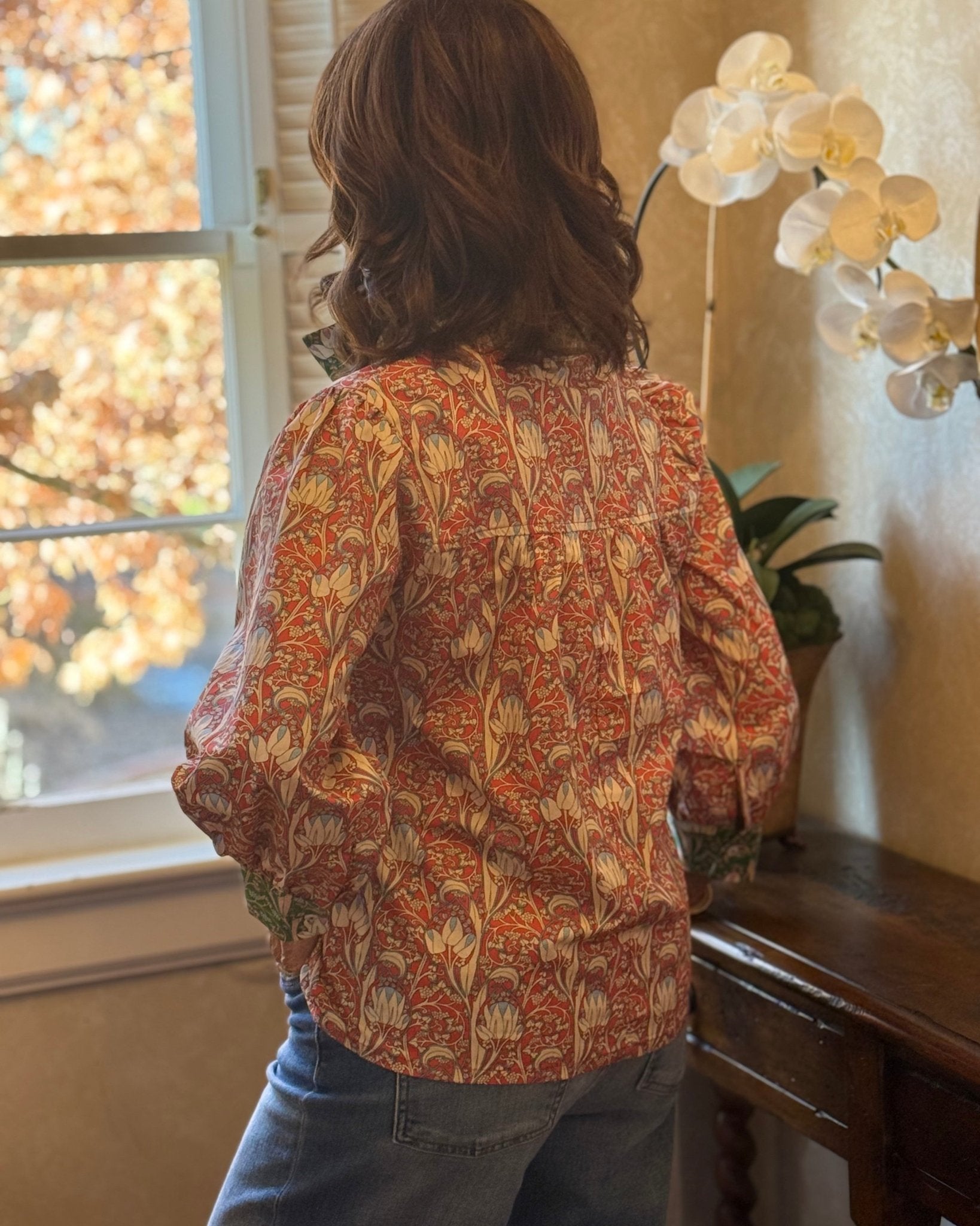 This is the blouse you've been looking for. The Eliza Top looks special, but it's easy to wear. It blends timeless charm with everyday versatility. Designed in a rich, intricate floral print with warm red tones and soft green accents, it feels collected and classic without being fussy. The lightly puffed shoulders add just the right amount of structure, while the relaxed body keeps it comfortable and flattering. Thoughtful details—like the contrast trim at the neckline and cuffs—give this blouse its elevated, boutique feel.
