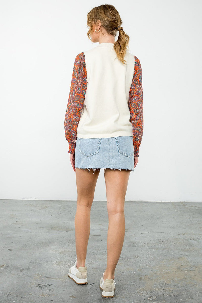 Description: Light-weight, butter-soft sweater fabrication throughout the bodice and fun, silky, floral-print sleeves create a great staple piece to transition into fall. Rounded neck, elasticized wrists with ruffle detail and slight banding at the waist enable the Britton Mixed Media Sweater to be worn tucked in or worn out. The high viscose content feels luxurious and ensures it will wash and wear beautifully for seasons to come!