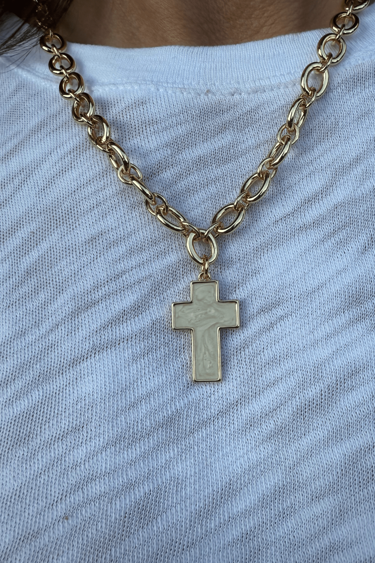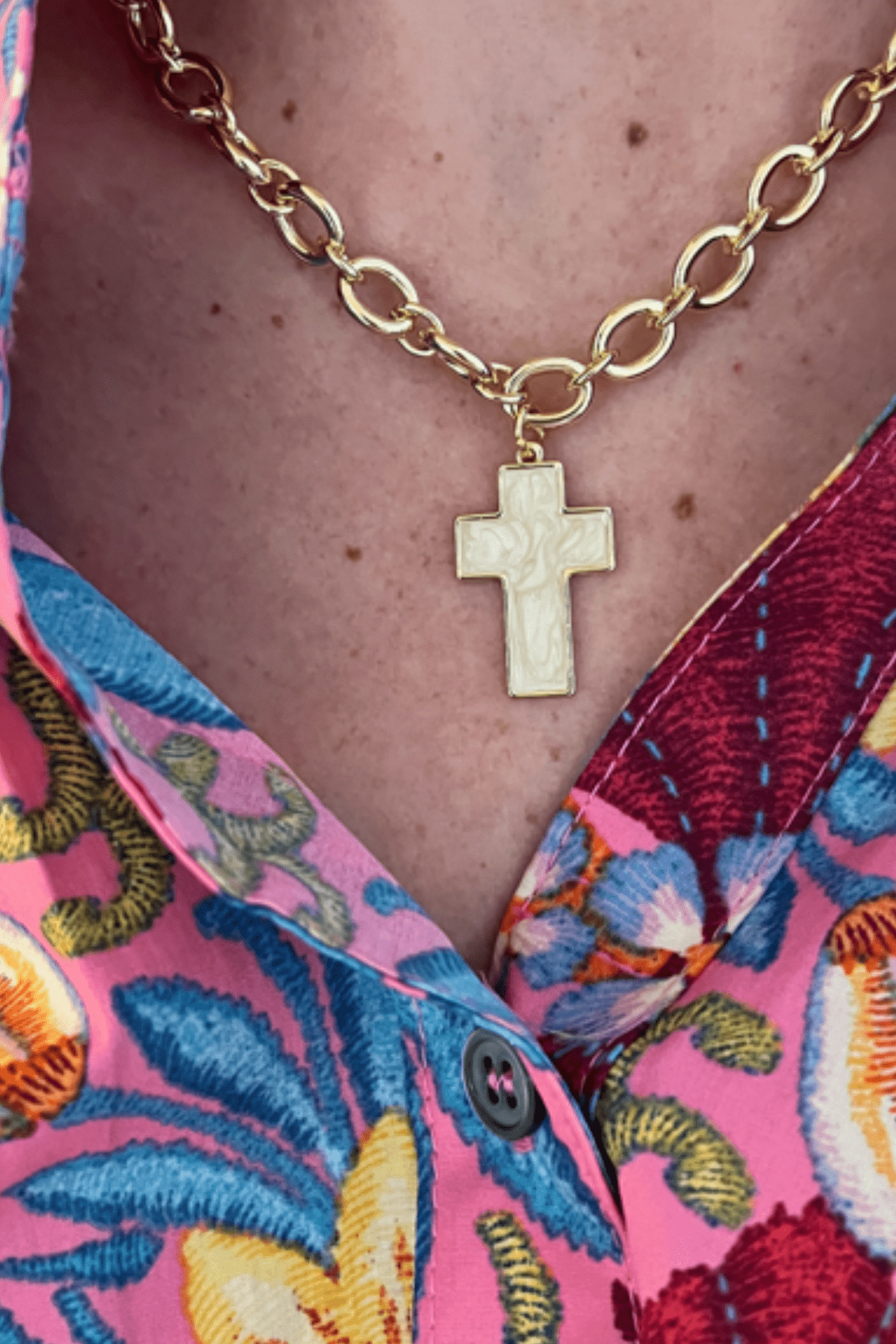 Description: Designed by Michelle McDowell the Joy Necklace is beautiful enough to stand alone or paired with other necklaces to create an eye-catching layered look. The Joy Necklace has a chunky round link chain necklace with 1" mother of pearl cross pendant. Made with 18K Gold plated brass, you'll enjoy years of wear with this special piece.