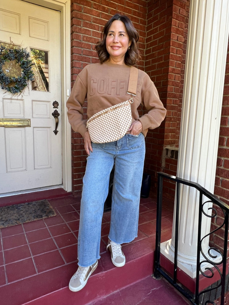 Description: Meet the Presley Woven Bum Bag in Checkered Tan. We've seen similar designer bags costing hundreds of dollars. Made of soft, woven vegan leather ours is a steal at $64! Beautiful hardware with a zipper closure and zippered slash pocket on the inside. Ample room to store all your necessities and a comfortable, adjustable matching tan strap for versatility. This designer inspired, crossbody bag is the perfect accessory to elevate your outfit!