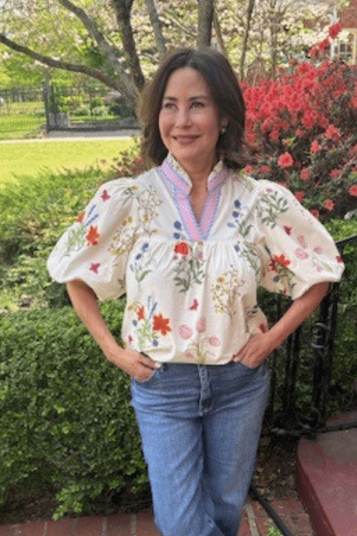 Description: She’s giving botanical brunch with a side of sass. With a cream backdrop blooming in vibrant florals and a neckline that says “oui oui!” thanks to that French blue and white striped trim, the Sophia Top is basically a garden party in shirt form. Puff sleeves bring the drama (the good kind), and she looks just as cute tucked into jeans as she does doing her thing untucked.
